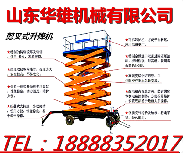 拖車剪叉式升降平臺是剪刀式結構,行走采用拖車動力作牽引,升降動力可選柴油機、電瓶、二相或三相電源,特殊場所也可選用防爆電機、電器等。此款升降設備控制方式為電動上、下控制升降,手、電兩用或遙控器控制,在停電時仍可使用。拖車剪叉式升降平臺具有移動方便快捷,升降平穩,載重量大,操作方便等特點,主要用于石油,電力,城建,郵電、機場、高速公路等各種行業的高空作業,尤其適用于遠距離高空作業。該系列液壓升降平臺起升有較高的穩定性,寬大的作業平臺和較高的承載能力,加大了高空作業范圍,并適合多人同時作業。使用拖車剪叉式升降平臺使高空作業效率提高許多,安全也很有保障。